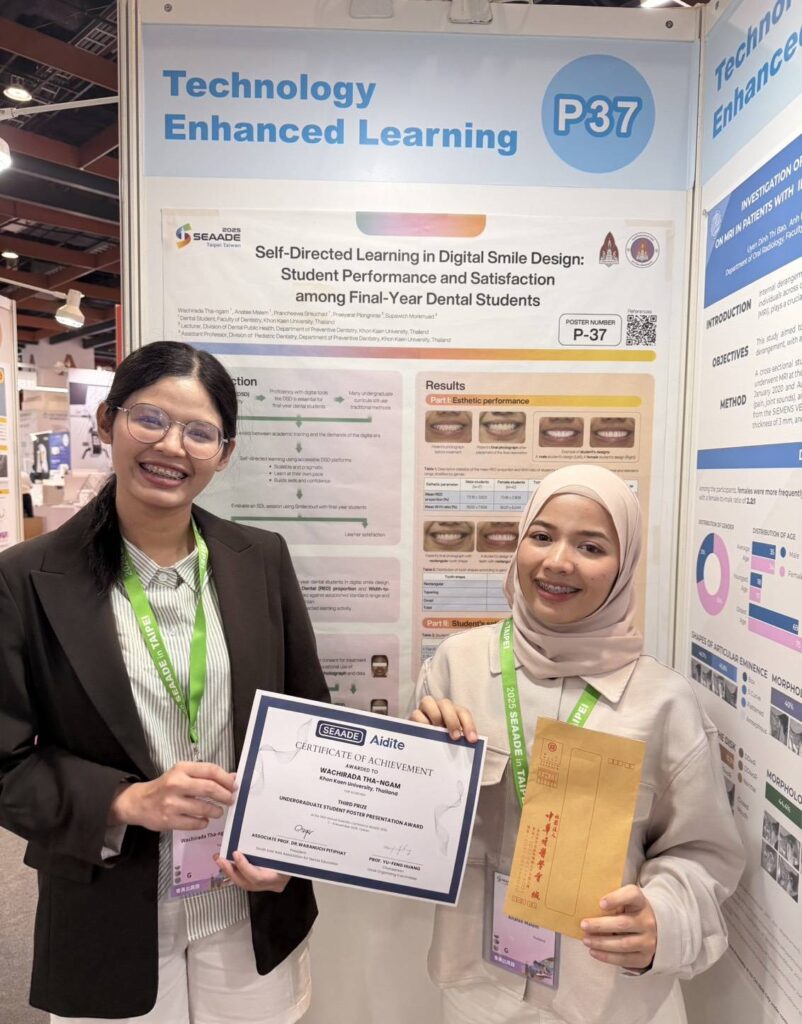 นักศึกษาระดับปริญญาตรีได้รับรางวัลจากการประกวดผลงานวิชาการบนเวทีนานาชาติ คณะทันตแพทยศาสตร์ มหาวิทยาลัยขอนแก่น ขอแสดงความยินดีกับนักศึกษาทันตแพทย์ ชั้นปีที่ 6 นทพ.วชิรดา ทางาม, นทพ.อานาตี ม่าเหล็ม และ นทพ.ปรานชีวา ศรีสุชาติ ในโอกาสได้รับ รางวัลที่สาม (Third Prize) ประเภท Undergraduate Student Poster Presentation Awardจากการนำเสนอผลงานวิจัยเรื่อง “Self-Directed Learning in Digital Smile Design: Student Performance and Satisfaction among Final-Year Dental Students” โดยมี อ.ทพญ.ปรียารัตน์ ปล่องนิราส และ ผศ.ดร.ทพ.ศุภวิชญ์ หมอกมืดเป็นอาจารย์ที่ปรึกษาโครงการวิจัยการประกวดดังกล่าวจัดขึ้นในงานประชุมวิชาการระดับนานาชาติ The 36th Annual Scientific Conference of South East Asia Association for Dental Education (SEAADE 2025) ณ เมืองไทเป ประเทศไต้หวัน ระหว่างวันที่ 7–9 พฤศจิกายน 2568 ซึ่งมีผู้เข้าร่วมจากหลากหลายประเทศในภูมิภาคเอเชียตะวันออกเฉียงใต้ รางวัลครั้งนี้สะท้อนถึงศักยภาพและความมุ่งมั่นของนักศึกษาทันตแพทย์ มหาวิทยาลัยขอนแก่น ในการพัฒนางานวิจัยทางทันตแพทยศาสตร์ในระดับสากล