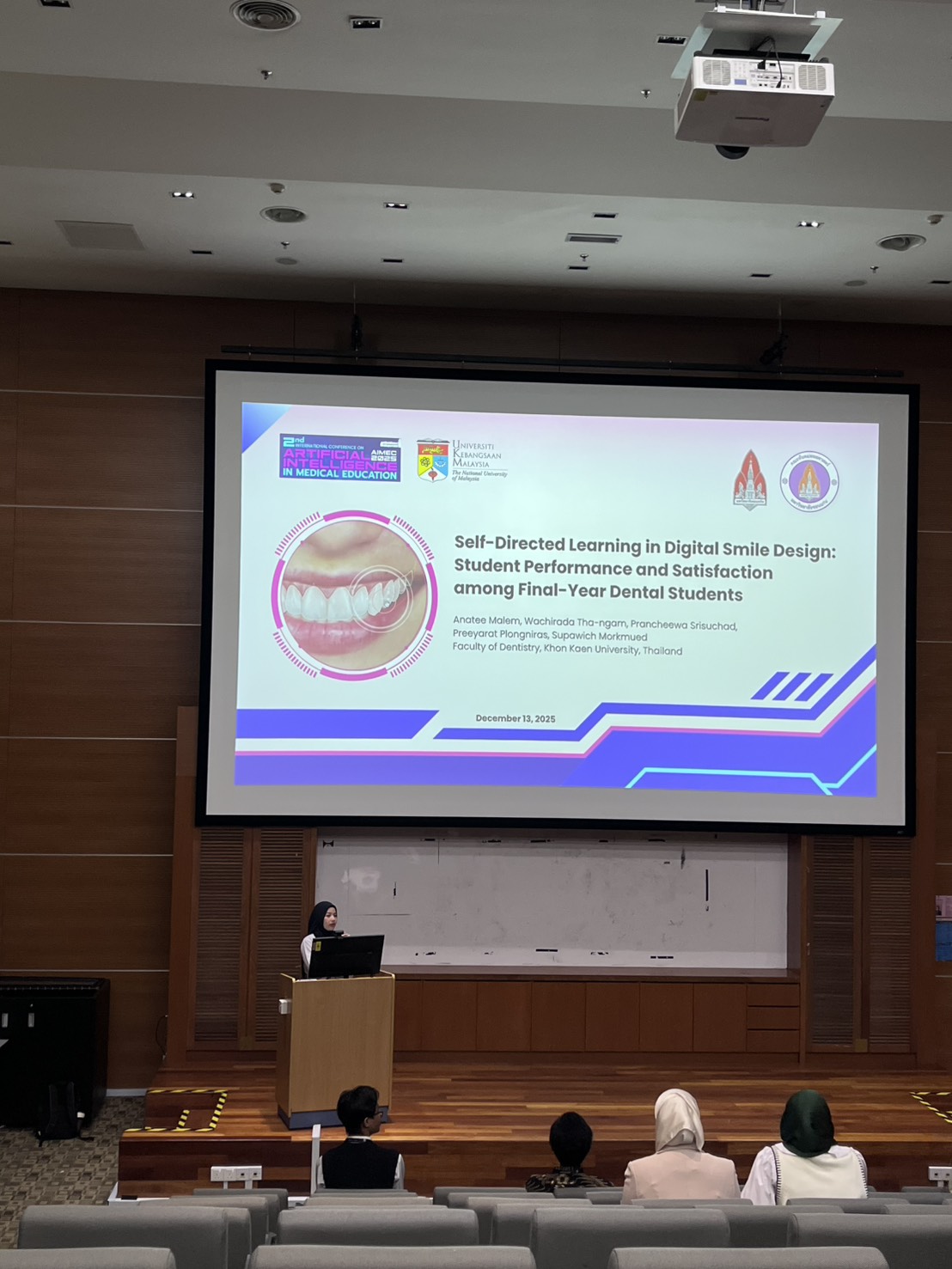 คณะทันตแพทยศาสตร์ขอแสดงความยินดีกับนักศึกษาระดับปริญญาตรี ชั้นปีที่ 6 กลุ่มวิจัย ที่สร้างชื่อเสียงให้กับสถาบันในระดับนานาชาติ จากการได้รับรางวัล Travel Award จากการประกวดการนำเสนอผลงานวิชาการ ในการประชุมวิชาการนานาชาติ The 2nd International Conference on Artificial Intelligence in Medical Education (AIMEC 2025) ซึ่งจัดขึ้นระหว่างวันที่ 12 – 14 ธันวาคม 2568 ณ กรุงกัวลาลัมเปอร์ ประเทศมาเลเซีย