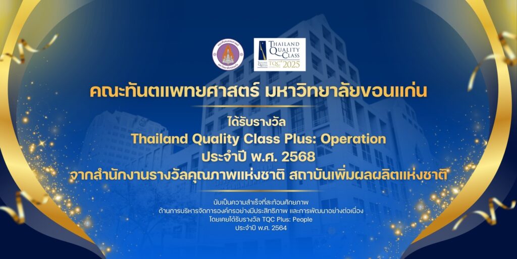 คณะทันตแพทยศาสตร์ มหาวิทยาลัยขอนแก่น ได้รับ รางวัลการบริหารสู่ความเป็นเลิศที่มีความโดดเด่นด้านการปฏิบัติการ (Thailand Quality Class Plus: Operation) ประจำปี 2568 โดยมีการแถลงข่าวการมอบรางวัลอย่างเป็นทางการในวันพฤหัสบดีที่ 26 กุมภาพันธ์ 2569 ณ ห้องมัฆวานรังสรรค์ บอลรูม สโมสรทหารบก กรุงเทพมหานคร จัดโดย สถาบันเพิ่มผลผลิตแห่งชาติ