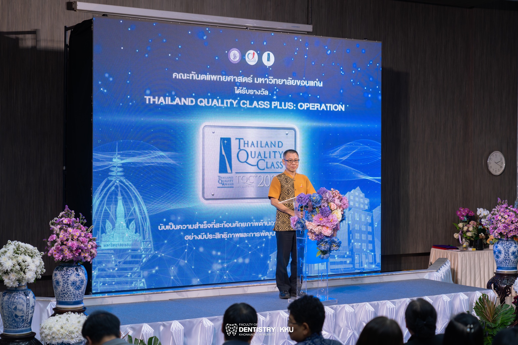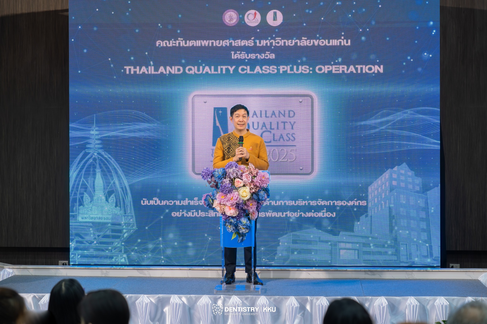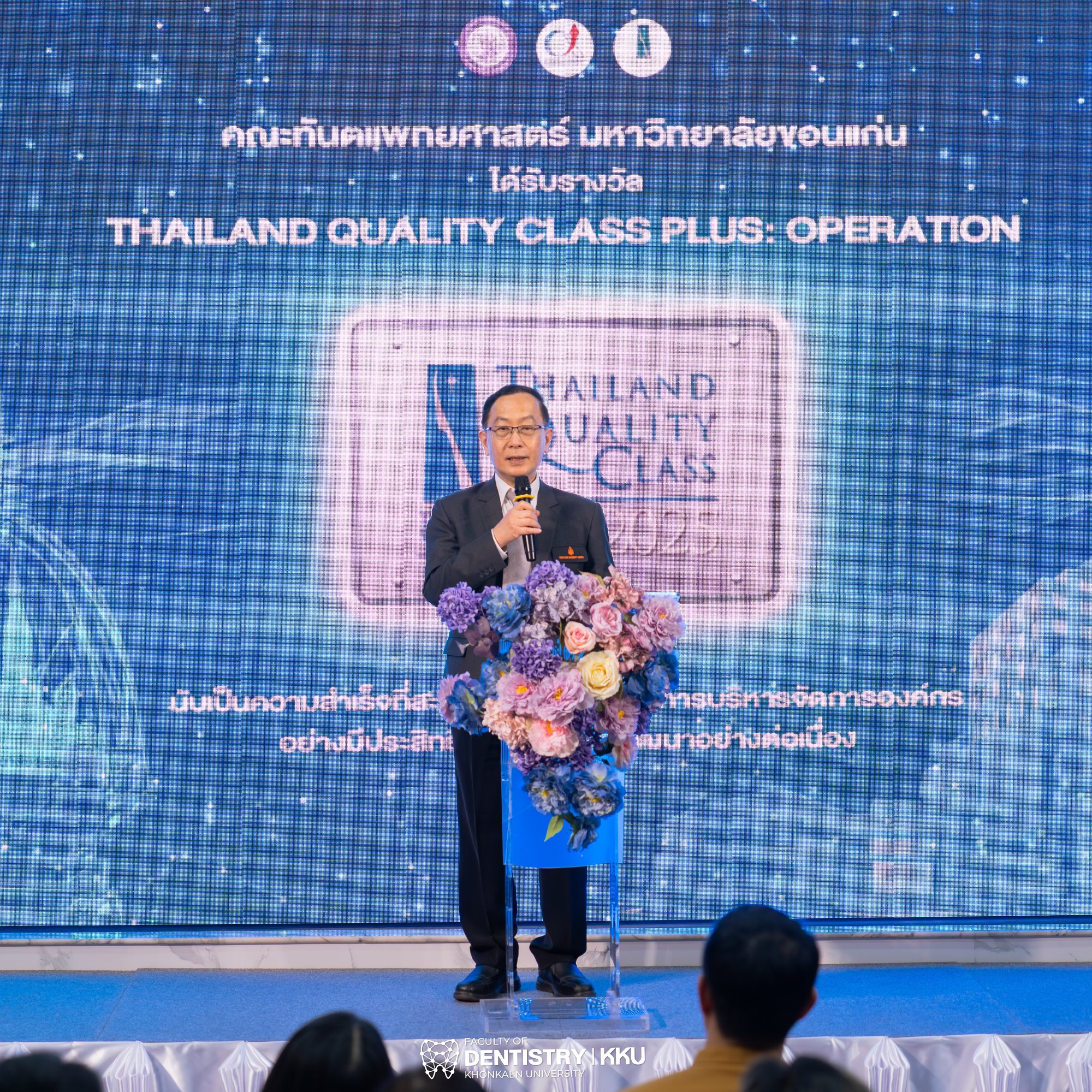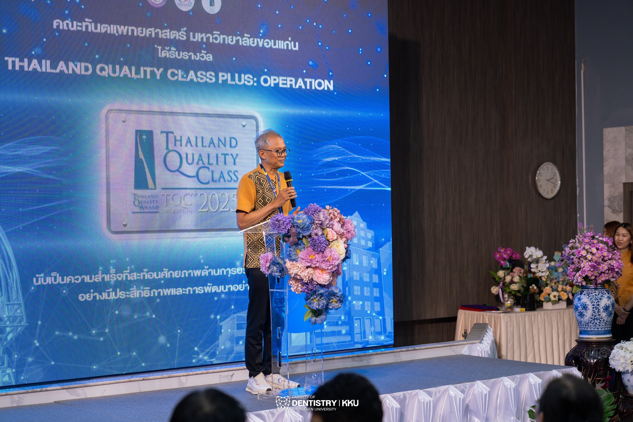 รศ.นพ.ชาญชัย พานทองวิริยะกุล อธิการบดีมหาวิทยาลัยขอนแก่น กล่าวว่า “ในนามของมหาวิทยาลัยขอนแก่น ขอแสดงความยินดีกับคณะทันตแพทยศาสตร์ มหาวิทยาลัยขอนแก่น ที่ได้รับ รางวัลคุณภาพแห่งชาติ ประจำปี 2568 : รางวัลการบริหารสู่ความเป็นเลิศที่มีความโดดเด่นด้านการปฏิบัติการ (TQC Plus Operation) รางวัลคุณภาพแห่งชาติถือเป็นเครื่องเชิดชูเกียรติองค์กรที่มีระบบบริหารจัดการอย่างสมดุลและครบถ้วนในทุกมิติ อยู่ในระดับมาตรฐานสากล ทั้งด้านการนำองค์กร การวางแผนกลยุทธ์ การดูแลลูกค้า บุคลากร และระบบการดำเนินงาน รวมถึงผลลัพธ์จากการดำเนินงานขององค์กร ความสำเร็จดังกล่าวสะท้อนถึงคุณภาพและความเข้มแข็งขององค์กร และยังเป็น องค์กรต้นแบบ (Role Model) ที่สามารถถ่ายทอดแนวทางและเครื่องมือในการพัฒนาให้แก่ผู้มีส่วนได้ส่วนเสีย ทั้งลูกค้า บุคลากร ชุมชน และสังคม ว่าจะได้รับการดูแลอย่างมีคุณภาพจากองค์กร”