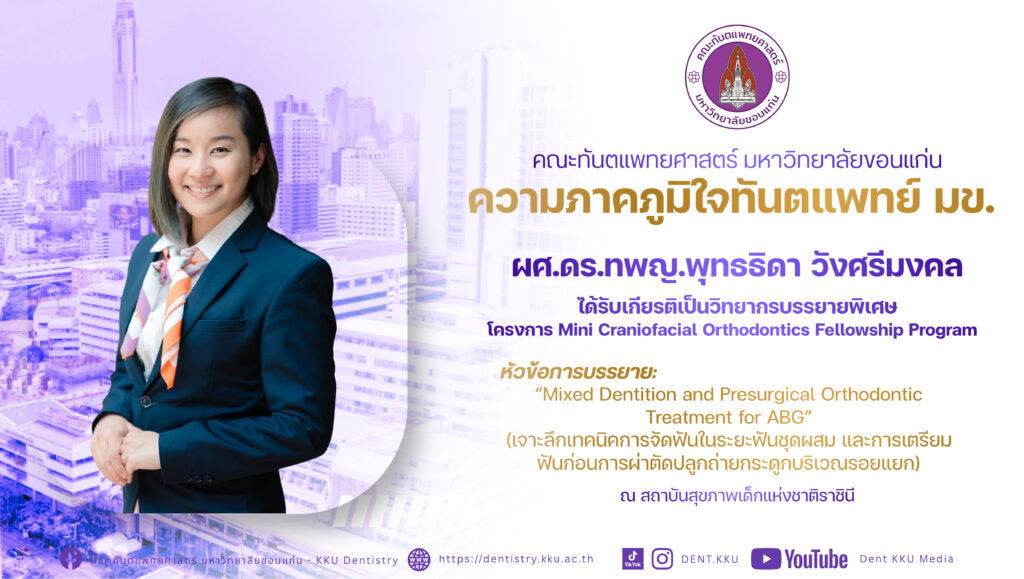 คณะทันตแพทยศาสตร์ มหาวิทยาลัยขอนแก่น ขอแสดงความภาคภูมิใจ ผศ.ดร.ทพญ.พุทธธิดา วังศรีมงคล ที่ได้รับเกียรติเป็นวิทยากรบรรยายพิเศษ ในโครงการ Mini Craniofacial Orthodontics Fellowship Program ณ สถาบันสุขภาพเด็กแห่งชาติมหาราชินี (โรงพยาบาลเด็ก)